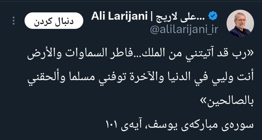 علی لاریجانی، دبیر شورای عالی امنیت ملی آیه ۱۰۱ سورهی مبارکهی یوسف را در صفحه خود در توییتر بعد از انتضاب رسمی توسط رهبر انقلاب نوشت: رَبِّ قَدْ آتَیْتَنِی مِنَ الْمُلْکِ وَعَلَّمْتَنِی مِنْ تَأْوِیلِ الْأَحَادِیثِ فَاطِرَ السَّمَاوَاتِ وَالْأَرْضِ أَنْتَ وَلِیِّی فِی الدُّنْیَا وَالْآخِرَةِ تَوَفَّنِی مُسْلِمًا وَأَلْحِقْنِی بِالصَّالِحِینَ