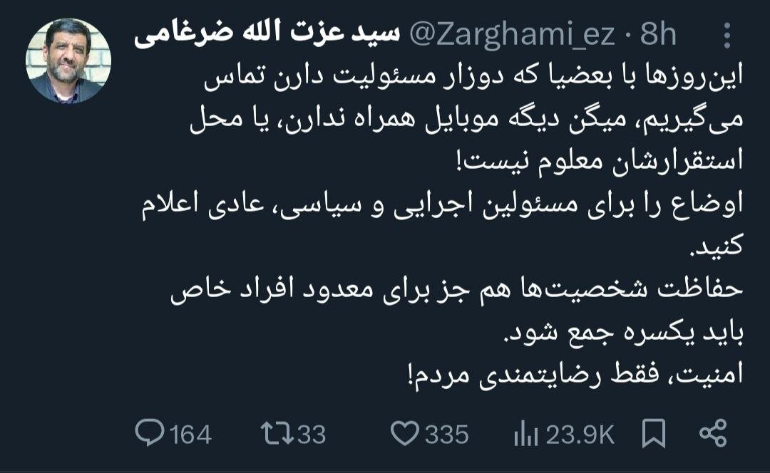 عزت الله ضرغامی وزیر پیشین میراث فرهنگی در توییتر نوشت: اینروزها با بعضیا که دوزار مسئولیت دارن تماس میگیریم، میگن دیگه موبایل همراه ندارن، یا محل استقرارشان معلوم نیست!
