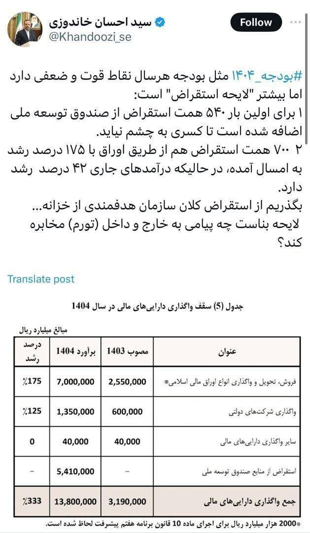 سید احسان خاندوزی وزیر سابق اقتصاد در واکنش به لایحه بودجه سال ۱۴۰۴ با انتشار پستی در شبکه اجتماعی ایکس نوشت: بودجه ۱۴۰۴ مثل بودجه هر سال نقاط قوت و ضعفی دارد اما بیشتر لایحه استقراض است.